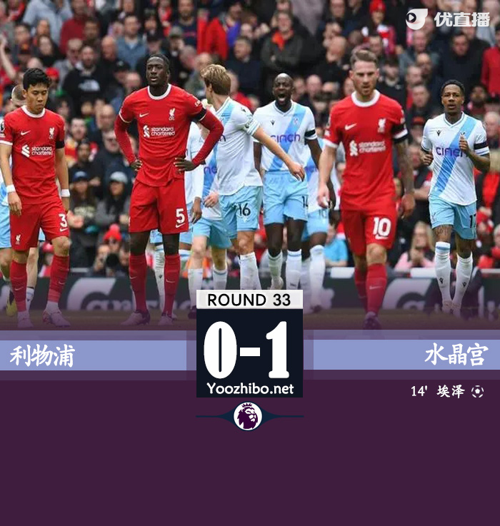 优直播讯:北京时间4月14日,英超联赛第33轮,利物浦在主场迎战水晶宫。比赛第14分钟,埃泽率先得分,第18分钟,范戴克滑到送马特塔单刀,罗伯逊贡献门线解围,第27分钟,远藤航乱战中击中横梁。最终利物浦主场0-1水晶宫连续3场比赛不胜,落后目前榜首曼城2分。