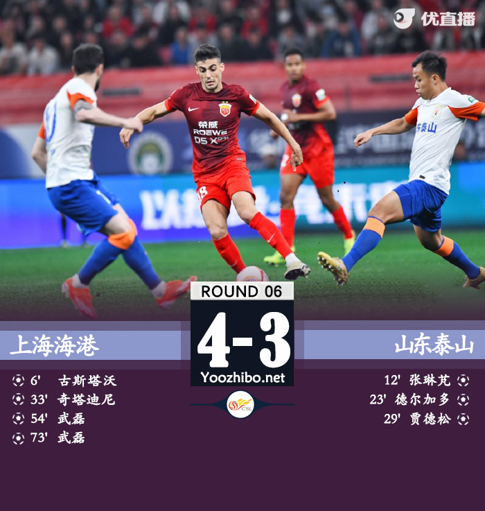 优直播讯:北京时间4月14日,中超联赛第6轮,上海海港主场对阵山东泰山。上半场古斯塔沃开场闪击破门,卡扎伊什维利打门折射扳平,德尔加多小角度抽射扳平,贾德松头球扩大比分,莱奥-奇塔迪尼乱战扳回一球,下半场武磊扳平比分,崔康熙抗议裁判被罚下场,武磊头球梅开二度。最终比分上海海港 4-3 山东泰山。