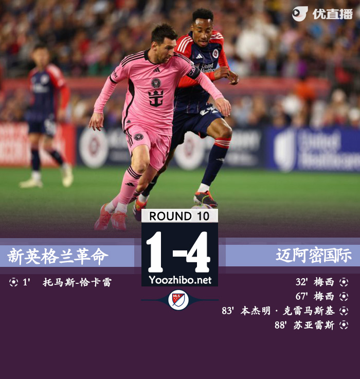 优直播讯:北京时间4月28日7点30分,美职联第10轮,迈阿密国际客场对阵新英格兰革命。上半场,尚卡莱开场不到1分钟就破门,梅西单刀扳平比分。下半场,梅西完成双响,克雷马斯和苏亚雷斯先后进球锁定胜局。全场比赛结束,迈阿密国际4-1新英格兰革命继续领跑东区。梅西本场比赛完成双响后本赛季10场比赛打进11球,联赛7场9球领跑MLS射手榜,近3场连续破门。