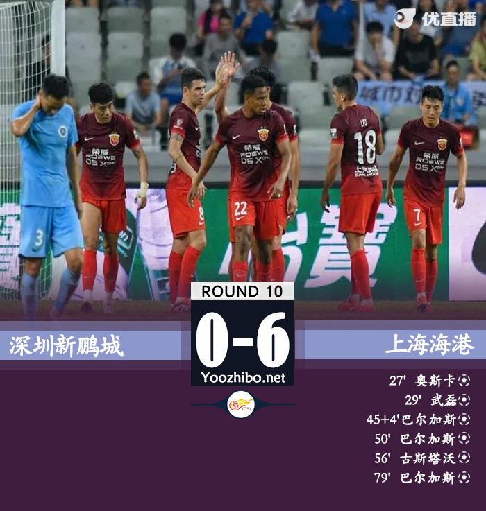 优直播讯:北京时间5月5日晚上20:00,中超第10轮,上海海港客场挑战深圳新鹏城。上半场,王浩开场8分钟放倒武磊吃到直红,李智送点奥斯卡笑纳,茹萨先后助攻武磊和巴尔加斯破门。下半场,巴尔加斯梅开二度,奥斯卡助攻古斯塔沃破门,奥斯卡造点巴尔加斯戴帽。全场结束,上海海港6-0深圳新鹏城。本场过后,上海海港6胜3平积21分排名第二,近两轮进11球失0球状态大火;深圳新鹏城2胜3平5负积8分,排名第12位。
