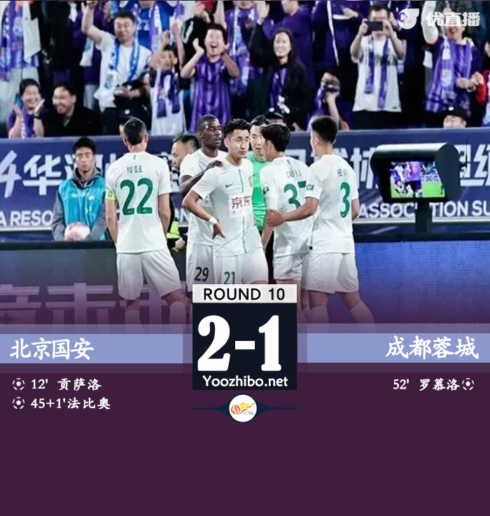 优直播讯:北京时间5月5日19点35分,中超第10轮北京国安主场迎战成都蓉城。上半场,费利佩错失绝佳机会,古加兜射破门,法比奥补时再入一球。下半场,罗慕洛世界波扳回一球后射中一次立柱。全场比赛结束,北京国安2-1成都蓉城。