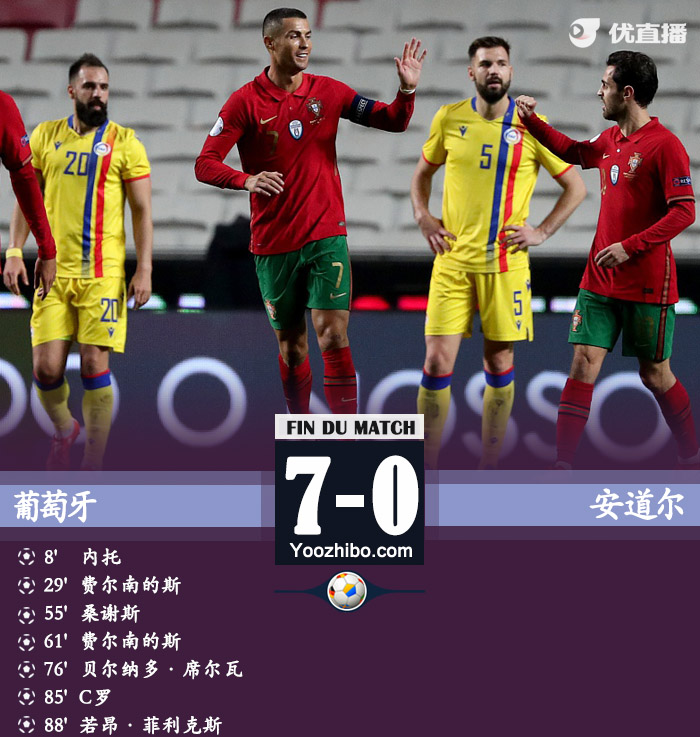 优直播讯:北京时间11月12日03:45(葡萄牙当地时间11日19:45),一场国际热身赛在光明球场展开争夺,葡萄牙主场7比0大胜安道尔,C罗传射,保利尼奥梅开二度,内托、桑切斯和菲利克斯进球,艾米利-加西亚自摆乌龙。