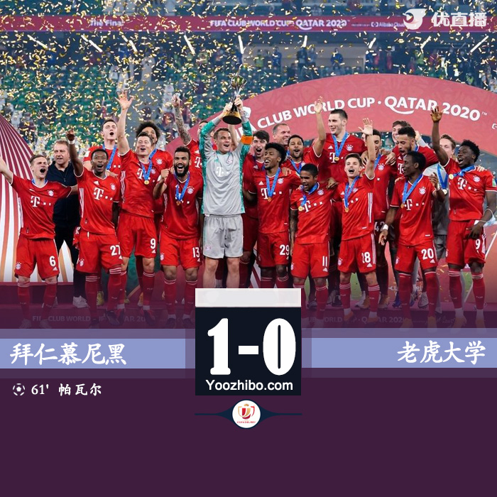 优直播2月12日讯 北京时间2月12日凌晨2点,世俱杯决赛,拜仁慕尼黑对阵老虎大学队。上半时双方互交白卷,基米希世界波破门被吹无效,萨内中门框。下半时帕尔瓦攻入制胜一球,托利索远射被扑击中门柱,科斯塔错失机会。最终,拜仁慕尼黑1-0战胜老虎大学,拜仁获得世俱杯冠军,成功加冕六冠王。
